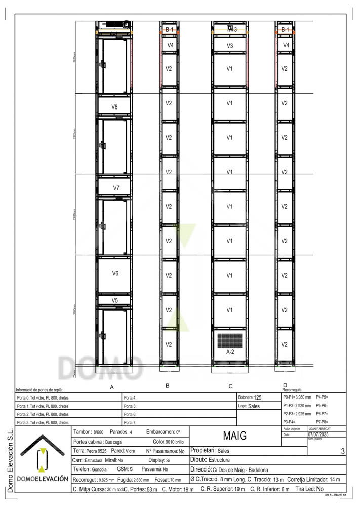 Al carrer Dos de Maig de Badalona, Domo Elevación ha subministrat i instal·lat un ascensor autoportant de vidre dins d’un conjunt d’habitatges unifamiliars d’estructura similar, on s’han realitzat diverses instal·lacions del mateix model per a diferents empreses ascensoristes.